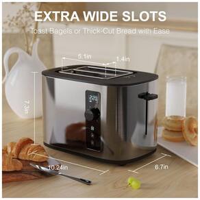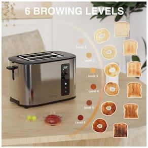 Torradeira Anfilank com 2 fendas extra largas, 6 níveis de tostagem, display de LED, termostato inteligente, funções de cancelamento, bagel e descongelar, grelha de aquecimento integrada e bandeja removível para migalhas.Permite ejeção manual