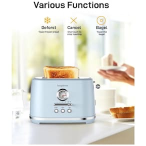 Torradeira 2 fatias Longdeem com 6 níveis de tostagem, desligamento automático, bandeja de migalhas removível, elevação manual e potência de 1000W.Permite ejeção manual