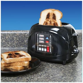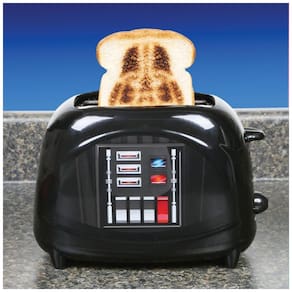 Torradeira Uncanny Brands Star Wars Darth Vader para 2 fatias, 700W, design temático com luzes LED e imagem de Darth Vader na torrada. Possui mostrador ajustável para nível de tostagem personalizado.Permite ejeção manual