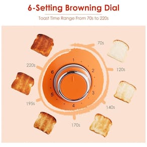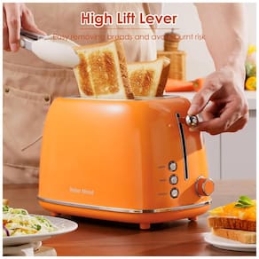 Corpo em aço inoxidável 18/8 de grau alimentício, design retrô, 6 níveis ajustáveis de tostagem, funções bagel, cancelar e descongelar, fendas extra largas, bandeja coletora de migalhas removível, proteção contra superaquecimento.Permite ejeção manual