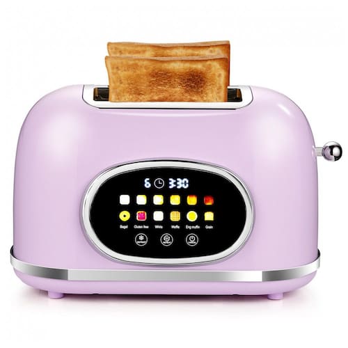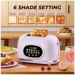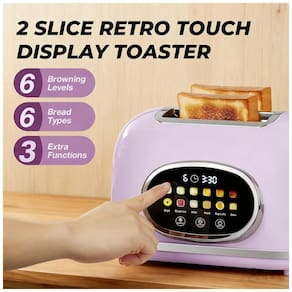 Torradeira elétrica de 2 fatias com tela touch, 6 níveis de ajuste de tostagem, 6 modos exclusivos de pão, funções descongelar, reaquecer e cancelar. Construção em aço inox com acabamento rosa lilás. Fendas extra largas de aproximadamente 3,8 cm. Memória do último ajuste e modo de repouso (sleep mode). Bandeja de migalhas removível e gerenciamento de cabo.Permite ejeção manual