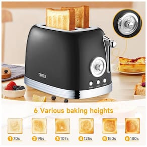 Torradeira vintage para 2 fatias com tampa de aço inoxidável, acessório para pão, 6 níveis de tostagem, funções de pré-aquecimento e descongelamento, cabo com porta-fio e bandeja removível.Permite ejeção manual