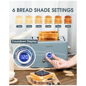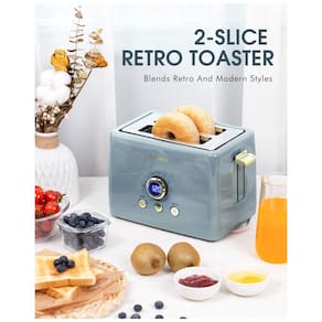 Torradeira retrô com 2 fatias, 6 níveis de tostagem, funções de bagel, descongelar e reaquecer. Possui timer digital LED, guias centralizadoras automáticas e saída elevada para fácil remoção. Inclui bandeja de migalhas removível e pés antiderrapantes.Permite ejeção manual