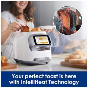 Torradeira automática Tineco com tecnologia IntelliHeat, 4 modos de torragem, tela LCD sensível ao toque, elevadores automáticos, construção em aço inoxidável e acabamento em porcelana branca.Permite ejeção manual