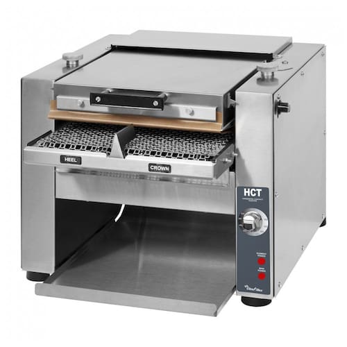 Torradeira de esteira com abertura de 33 cm, correia de malha de arame, superfície de torrada de alumínio, área de carga segura com proteção contra queimaduras, placa inclinada para facilitar o carregamento, aquecedores programáveis e bandeja de migalhas removível.Permite ejeção manual