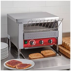 Torradeira de esteira comercial com abertura, 208V, 3600W, 1200 fatias por hora. Tosta até três fatias lado a lado. Controle de velocidade da esteira ajustável e controle independente de calor com 8 configurações. Estrutura em aço inoxidável com pernas e botões de controle em inox.Permite ejeção manual