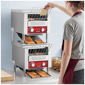 A torradeira de esteira dupla empilhada da Avantco é uma solução eficiente e rápida para sua cozinha comercial. Com capacidade para torrar até 300 fatias de pão por torradeira, por hora, em uma esteira de 10 polegadas com 3 aberturas para uma variedade de pães, bagels e muffins. Seu guia frontal ajuda a carregar alimentos com segurança. Com controle de velocidade da esteira totalmente ajustável e controle de calor com 4 configurações, você pode obter a torrada perfeita. O modo de espera reduz o consumo de energia em períodos de baixa demanda, ao mesmo tempo que reduz o tempo de pré-aquecimento nos horários de pico. Esta torradeira é ideal para qualquer cozinha comercial, sendo rápida, eficiente e fácil de usar. Além de torrar até 600 fatias de pão por hora, ela acomoda diversos tipos de pães, de fatias tradicionais de pão branco a metades de bagels. Possui discagem de velocidade ajustável para níveis de torrada personalizados e entra em modo de espera quando não está em uso para economizar energia. Perfeita para cafeterias, buffets e cafeterias, especialmente durante o horário de pico da manhã!