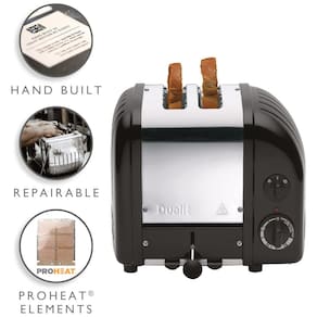 Torradeira com 3 níveis de tostagem, elementos ProHeat substituíveis, configuração para bagels (tosta o lado cortado e aquece o outro), função de descongelamento, montada à mão no Reino Unido, totalmente reparável com peças substituíveis.Permite ejeção manual