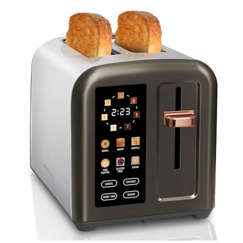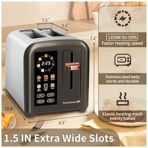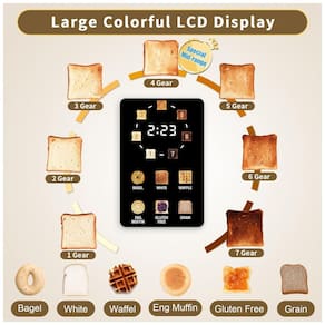 Torradeira elétrica com 2 fatias, 7 níveis de tostagem, display LCD colorido com controle de toque, função de pré-seleção de pão e sombra, velocidade de torragem 50% mais rápida que modelos convencionais.Permite ejeção manual