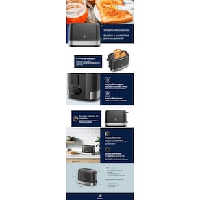 8 níveis de tostagem, função descongelar, função aquecer, bandeja coletora de migalhas removível, design moderno em aço inoxidável escovado, aberturas extra largas, botões luminosos em LED branco.Permite ejeção manual