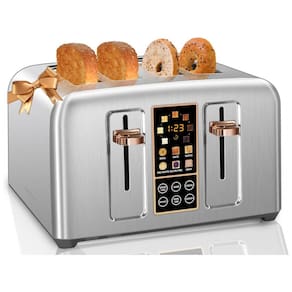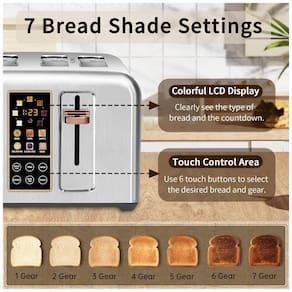 Torradeira elétrica SEEDEEM com tela LCD, controle sensível ao toque, 7 níveis de tostagem, função de descongelamento e bandeja de migalhas removível. Acomoda até 4 fatias.Permite ejeção manual