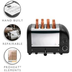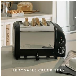 Torradeira elétrica para 4 fatias Dualit Classic NewGen, com 3 níveis de tostagem, aquecimento de bagels, função de descongelamento e bandeja de resíduos removível. Construída à mão no Reino Unido com elementos ProHeat substituíveis.Permite ejeção manual
