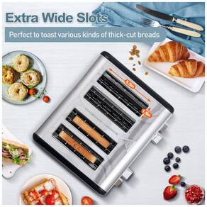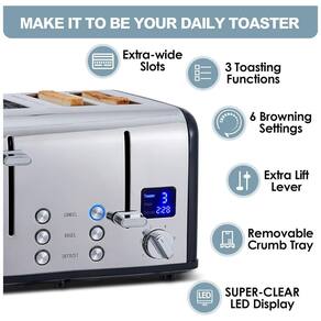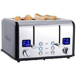 Torradeira elétrica para 4 fatias, display LED, 6 níveis de tostagem, funções Cancelar, Bagel e Descongelar, bandeja removível, design em aço inoxidável.Permite ejeção manual