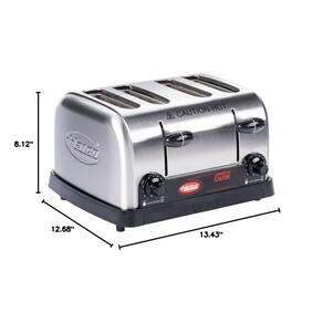 Torradeira elétrica prateada para 4 fatias, com 7 níveis de tostagem, slots autocentrantes, controles individuais de cor, bandeja de migalhas removível e certificação UL/CUL.Permite ejeção manual