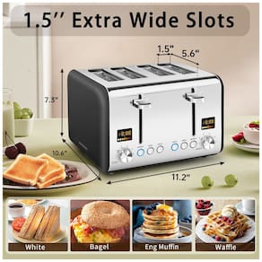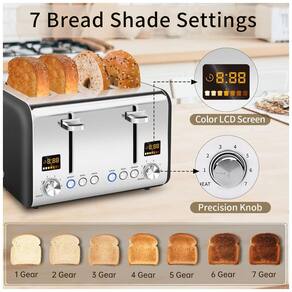 Torradeira elétrica com capacidade para 4 fatias, potência de 1800W, 7 níveis de tostagem, controle independente para duas áreas, visores LCD coloridos, botão iluminado e design em prateado.Permite ejeção manual