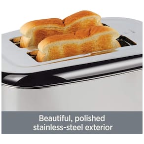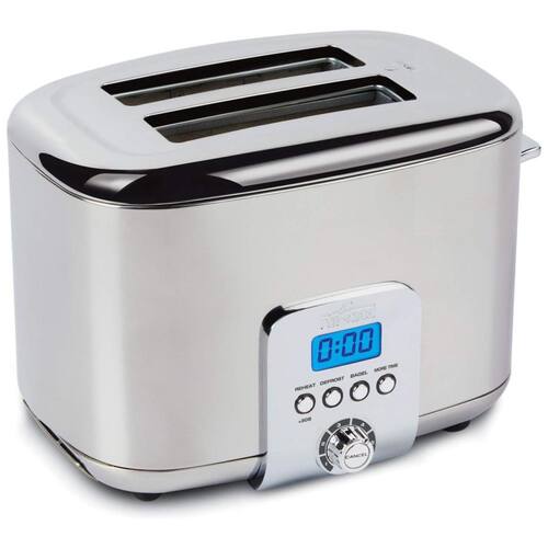 Torradeira Elétrica All Clad TJ822D51 com 2 fatias, 6 níveis de tostagem, display LED com timer, funções de descongelamento e reaquecimento, fendas extra largas autocentrantes e corpo em aço inoxidável.Permite ejeção manual