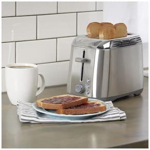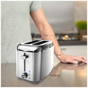 Torradeira elétrica de 2 fatias em aço inoxidável escovado com ranhuras extra largas, botões de função iluminados para diferentes tipos de pão e alavanca com levantamento extra.Permite ejeção manual