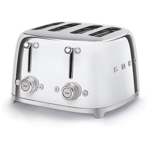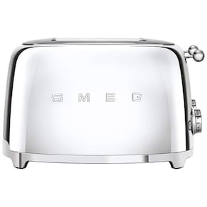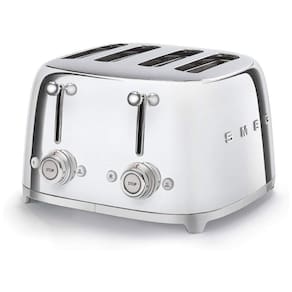 Torradeira elétrica Smeg com 4 compartimentos, controles de torragem independentes, funções de reaquecimento, descongelamento e bagel, 6 níveis de torragem, e bandeja de migalhas removível.Permite ejeção manual