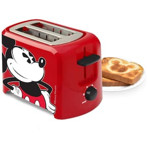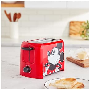 Torradeira Elétrica Mickey Mouse com capacidade para 2 fatias, controle de tostagem ajustável, bandeja de migalhas e pés antiderrapantes. Possui impressão do personagem Mickey na torrada.Permite ejeção manual