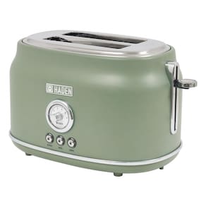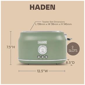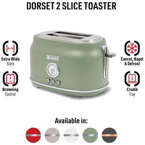 Torradeira elétrica 2 fatias em aço inoxidável com acabamento verde cedro e detalhes cromados. Possui fendas largas com função de autocentralização, elevação extra, funções de descongelar e reaquecer, controle de tostagem ajustável, base com pés antiderrapantes e bandeja coletora de migalhas removível. Corpo com toque frio.Permite ejeção manual