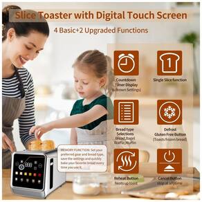 Torradeira digital para 2 fatias com visor LCD, 6 níveis de tostagem, funções de cancelar, descongelar e reaquecer, e programas para diferentes tipos de pães (Bagel, Pão Branco, Waffle, Muffin Inglês, Sem Glúten e Grãos).Permite ejeção manual