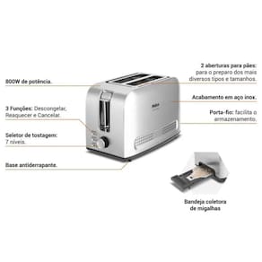 Torradeira Philco com 7 níveis de tostagem, funções descongelar, reaquecer e cancelar, capacidade para 2 torradas, bandeja coletora de migalhas e porta-fio.Permite ejeção manual