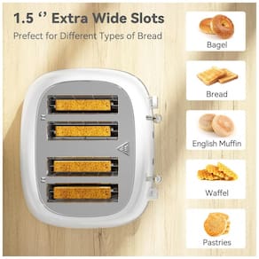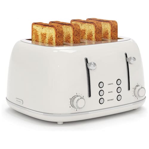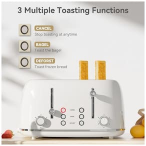 Torradeira retrô KitchMix para 4 fatias com 6 níveis de tostagem, slots extra largos de 3,8cm, funções bagel, descongelar, reaquecer e cancelar. Possui bandejas removíveis para migalhas e design em aço inoxidável.Permite ejeção manual