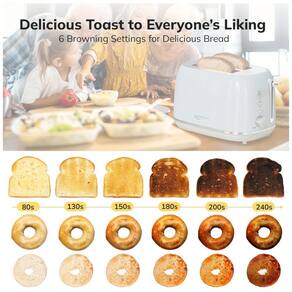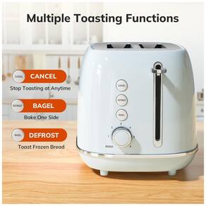 Design retrô, acabamento em aço inoxidável azul 18/8, fendas extralargas de 3,8 cm, 6 níveis de tostagem, funções automáticas (bagel, descongelar, cancelar), alavanca elevada, base antiderrapante, recipiente coletor de migalhas removível, livre de BPA.Permite ejeção manual