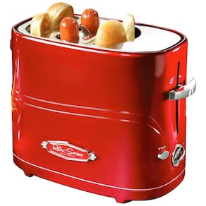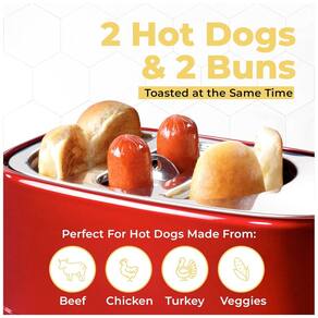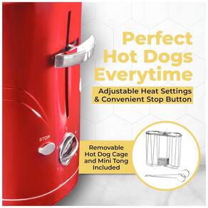 Torradeira retrô para até 2 cachorros quentes e pães simultaneamente, com timer ajustável e botão de parada. Inclui mini pinças e gaiolas para manuseio seguro.Permite ejeção manual