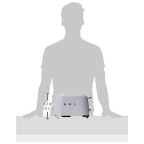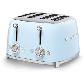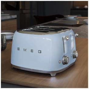 Torradeira Smeg com 4 compartimentos, controles duplos independentes, funções de reaquecimento, descongelamento e bagel, 6 níveis de tostagem e exterior em aço com revestimento a pó.Permite ejeção manual