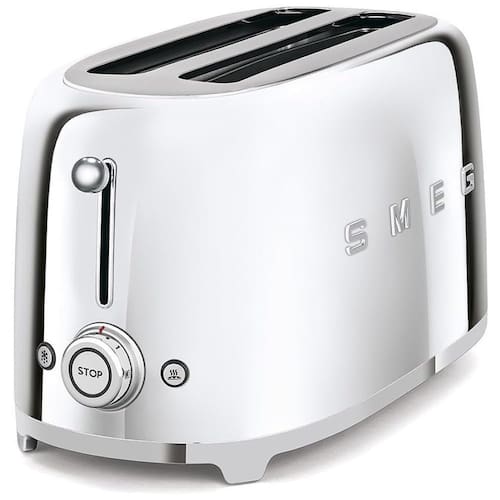 Adicione um toque retrô à sua cozinha com a linha de eletrodomésticos Smeg 50s Retro! Feita com corpo de aço revestido a pó, base cromada polida, alavanca de aço inoxidável e botão cromado iluminado, esta torradeira da Smeg é feita para durar e nunca sairá de moda. Com 2 slots extra largos, suportes auto centrantes, 6 níveis de tostagem, 3 programas pré-definidos para reaquecer, descongelar e bagels, esta torradeira ainda possui pés antiderrapantes e bandeja de migalhas removível em aço inoxidável.