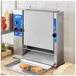 Torradeira vertical com capacidade para 1440 pães/hora, 12 segundos por torrada, termostato ajustável, design exclusivo para tostar partes superior e inferior simultaneamente, compacta, durável, construída em aço inoxidável, motor potente.Permite ejeção manual