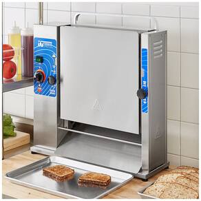 Torradeira vertical com termostato ajustável, design único para tostar partes superiores e inferiores simultaneamente, construção em aço inoxidável e motor potente.Permite ejeção manual