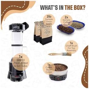 Torrador de café Fresh Roast SR800: um torrador automático de café que pode torrar até 236 ml de grãos verdes por vez. Ele tem um sistema de ventilação ajustável que remove a casca e o excesso de fumaça. Ele também tem um display digital que mostra o tempo e a temperatura da torra. Ele tem uma potência de 1600 W e uma voltagem de 120 V.
