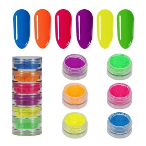 Torre Com 6 Pó Neon Florescente Unhas De Gel Maquiagem Itens Inclusos: Torre com 6 pó neon Cores da torre: Azul, Laranja, Rosa, Roxo, Amarelo e Verde Capacidade: Aprox. 5g
