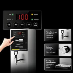 Características Técnicas: Grande reservatório: 7 litros de água quente Temperatura: até 100C com controle através do painel frontal e indicador digital Aquecimento rápido: aquece os 7 litros de água em apenas 10 minutos. Retoma a temperatura em apenas 1 minuto garantindo água quente constante Reservatório com isolamento térmico para garantir o mínimo consumo de energia Dupla filtragem: acompanha dois filtros para eliminar metais pesados, cloro e impurezas, garantindo água sempre filtrada e fresca Instalação simples e intuitiva Versatilidade: preparação de cafés, chás, chimarrões, sopas, caldos, macarrão instantâneo, mingais, fórmulas infantis, esterilizar pequenos itens etc Material: Aço Inox