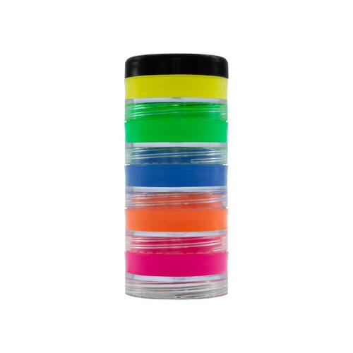 Torre com 5 potes de 3g cada na cores: Amarelo, Azul Claro, Laranja, Pink e Verde Limão.