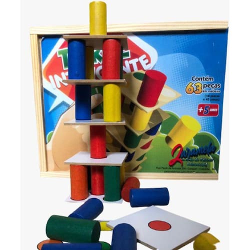 Confeccionado em madeira e MDF 18 placas medindo 7,5 x 7,5 cm e 45 cilindros de madeira pintados medindo 3,5 cm de altura Embalagem: caixa de madeira com tampa serigrafada medindo 20 x 20 x 8 cm; lacrada com película de PVC encolhível, e papelão para maior proteção do brinquedo. Marca: Zaramela Ean: 7893177920201