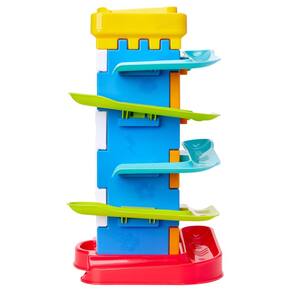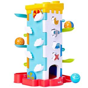 Na Torre de Atividades da Buba dá para colocar bolinhas para deslizarem nas pistas, encaixar formas e até levar nosso solzinho para passear pelas nuvens.