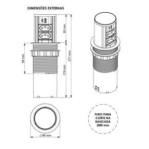 Dimensões gerais: Dimensional externo: diâmetro 97 mm x 181 mm Dimensional de corte: diâmetro 80 mm x 179 mm (faça a furação somente com a peça em mãos)