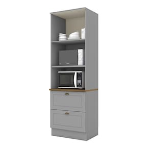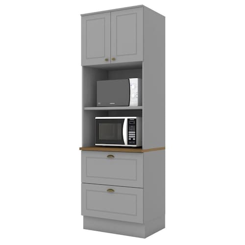 Torre Quente 2 Fornos Americana Cinza Com Tampo Nature - Móveis Cinza/nature Torre Quente 2 Fornos Americana - Móveis Henn Os módulos da Cozinha Modulada Americana é uma linha clássica e atemporal, pensada para transformar esse ambiente no cantinho preferido do seu lar. Produzida 100% em MDF, na cor branco, uma pintura UV fosca, todas as portas e gavetas contam com usinagem em baixo relevo e os puxadores em zamac ouro velho garantem um charme extra a qualquer ambiente. ESPECIFICAÇÕES: - Estrutura 100% MDF - Acabamento UV - 2 Portas - Dobradiças de 35mm com amortecimento - 2 Gavetas - Corrediças telescópicas - Espaço para eletrodomésticos: 1- 42,4 x 68,4 x 48 cm e 2- 38,6 x 68,4 x 53,3 cm - Puxadores em zamac ouro velho - Usinagem em baixo relevo - Tampo BP/MDP - Opção de instalação sem pés, suspensa - Amplo espaço interno