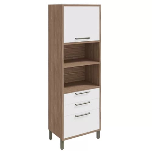 A Torre Quente Syrah, é um produto 100% MDF, seu acabamento é em pintura U.V. e fita de bordo FF. Possui puxador em ABS e pés em ABS com regulagem, e possui prateleira e espaço para microondas e forno elétrico. Suas gavetas possui corrediças telescopica.