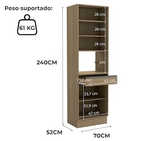 Peso Suportado: 20kg prateleira do forno/microondas, 7kg por prateleira e 6kg por gaveta.