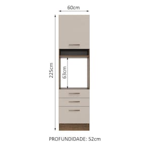 O espaço para forno é de 63 cm x 57 cm com abertura para saída do calor. Além disso possui um nicho decorativo para deixar itens do dia a dia mais a mão. Além disso, os pés são em PVC com regulagem de altura e o rodapé removível em MDP, de encaixe fácil.