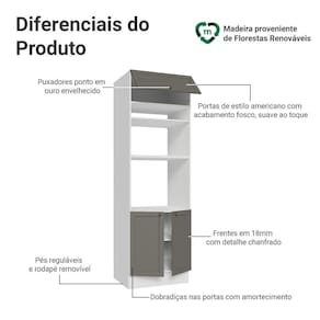 O acabamento de alta resistência da estrutura é em Branco e das frentes em Cinza, refletindo o estilo americano com um toque moderno. Possui uma textura suave ao toque, trazendo leveza e sofisticação ao ambiente. O destaque vai para os puxadores ponto em ouro envelhecido, feitos com metal resistente, que adicionam personalidade e um charme único.