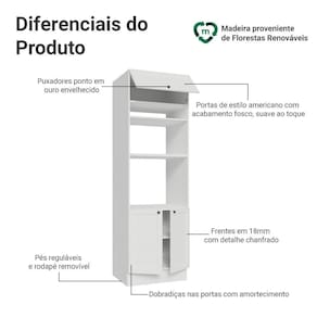 O acabamento de alta resistência da estrutura e das frentes é em Branco, refletindo o estilo americano com um toque moderno. Possui uma textura suave ao toque, trazendo leveza e sofisticação ao ambiente. O destaque vai para os puxadores ponto em ouro envelhecido, feitos com metal resistente, que adicionam personalidade e um charme único.