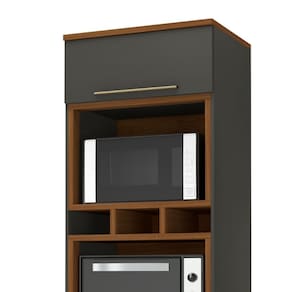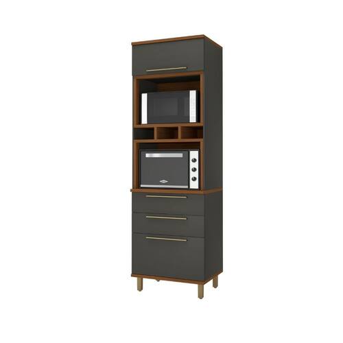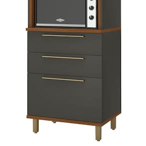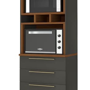 O acabamento em pintura ultravioleta e fita de borda em melamina proporciona um visual moderno e protecao extra contra desgastes. Os detalhes de qualidade incluem puxador Silky em aluminio, dobradicas com amortecedor e corredicas telescopicas largas de 45 mm, que garantem suavidade e durabilidade no uso diario. Os pes com regulagem de altura permitem adaptacao a diferentes tipos de piso.
