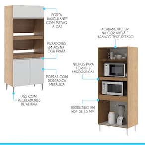 Características do Balcão: Produzido em MDP de 15 mm com acabamento UV nas cores avelã e branco texturizado, portas com dobradiças metálicas, porta basculante com pistão a gás, puxadores perfil em ABS na cor prata, pés reguláveis em ABS prata, prateleiras com capacidade para 5, 8 e 10 kg, nicho superior para forno -40x77x50,5 cm-, nicho inferior para micro-ondas -35x77x50,5 cm-