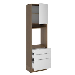 A Torre Quente de 60 cm da linha de cozinhas Stella da Madesa conta com três gavetas espaçosas, sendo uma mais profunda, todas com corrediças telescópicas que possibilitam abertura total.