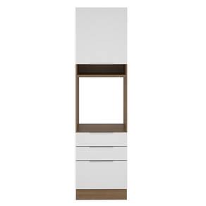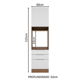 O espaço para forno é de 63 cm x 57 cm com abertura para saída do calor. Além disso possui um nicho decorativo para deixar itens do dia a dia mais a mão. Os pés são em PVC com regulagem de altura e rodapé removível de madeira de fácil encaixe.